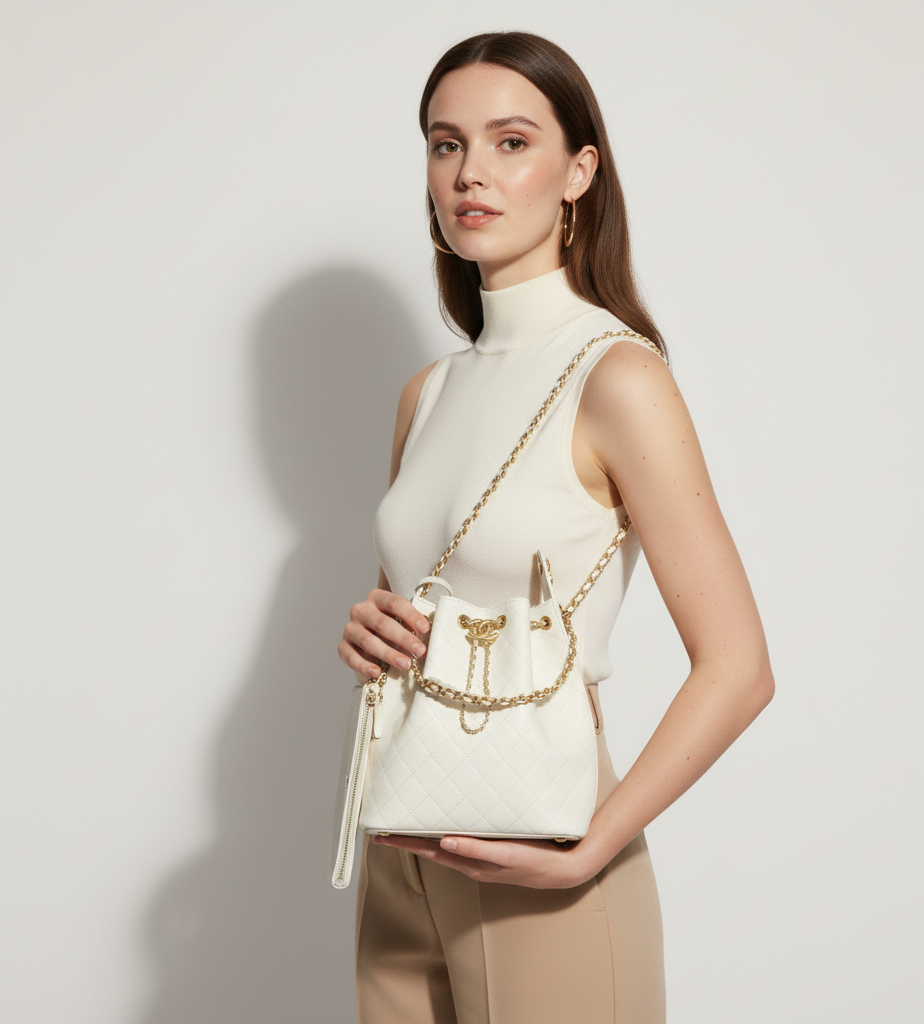 Design: Large hobo-style bucket bag with quilted pattern, retro gold coin button, and drawstring closure