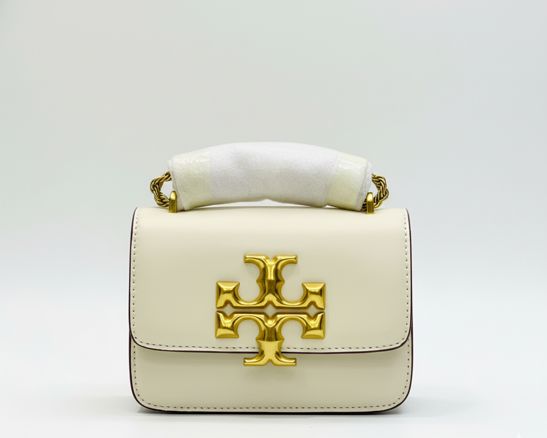 Design Highlight: Signature oversized Tory Burch double-T logo in polished gold metal